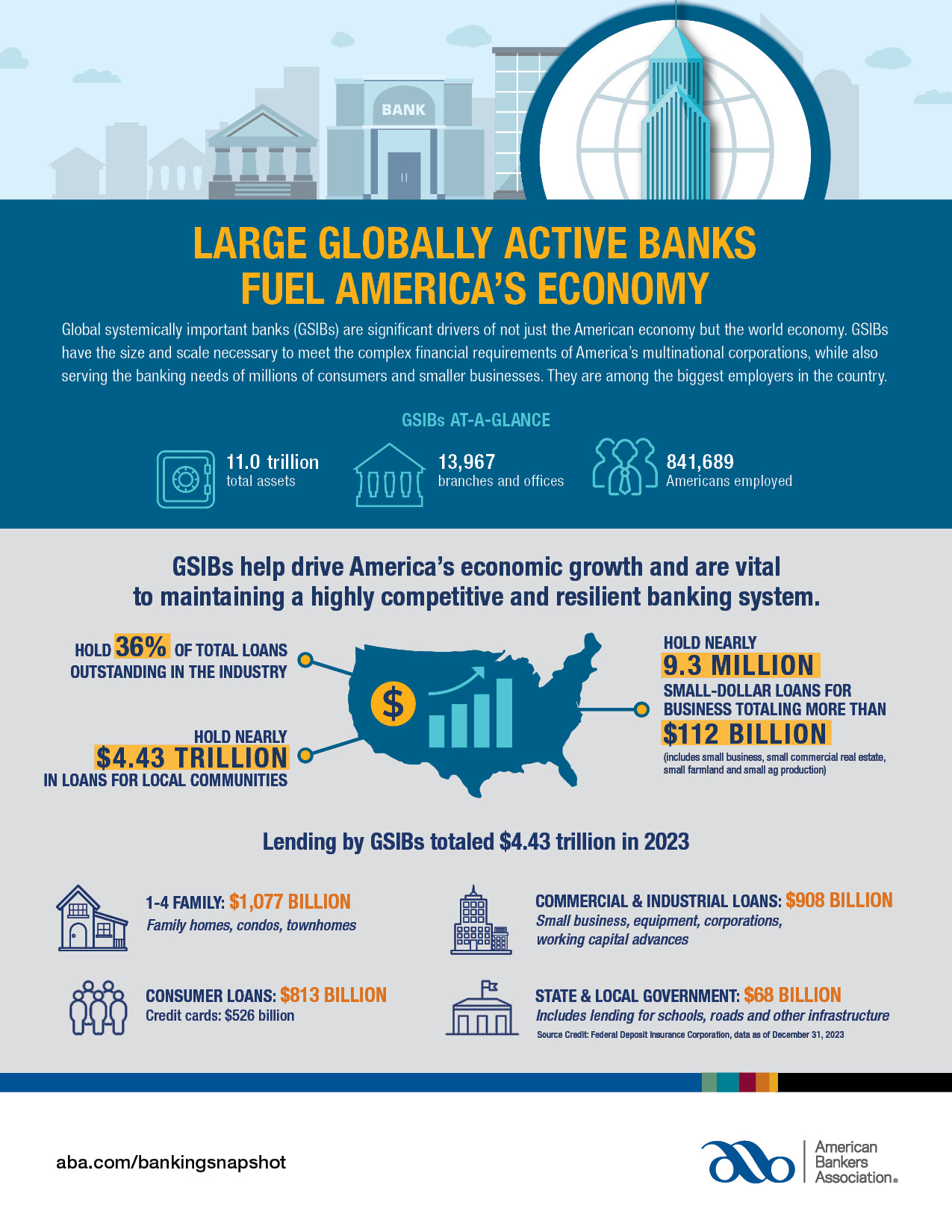 Global systemically important banks (GSIBs) are significant drivers of not just the American economy but the world economy. GSIBs have the size and scale necessary to meet the complex financial requirements of America’s multinational corporations, while also serving the banking needs of millions of consumers and smaller businesses. They are among the biggest employers in the country.